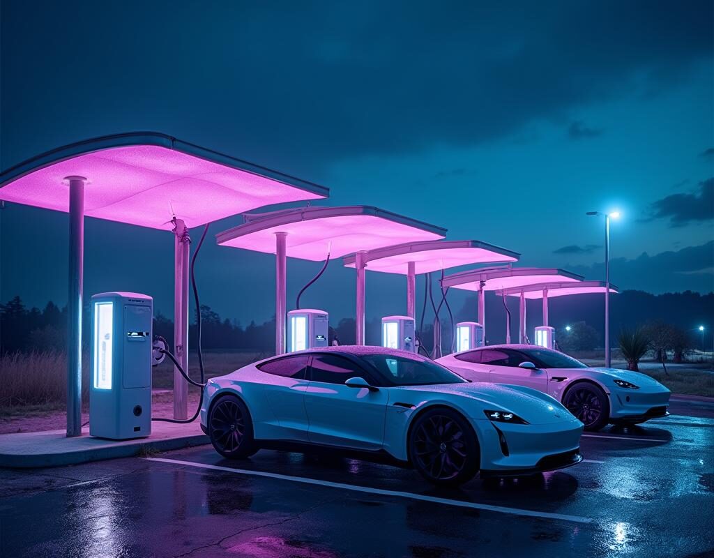 Beliebte Elektrofahrzeuge an Schnellladestationen. Mehrere moderne Elektroautos stehen an einer Schnellladestation und laden gleichzeitig. Ein moderner Ladepark mit mehreren Elektroautos, die an Hochleistungs-Schnellladesäulen angeschlossen sind. Das Bild symbolisiert den E-Auto-Boom 2025.