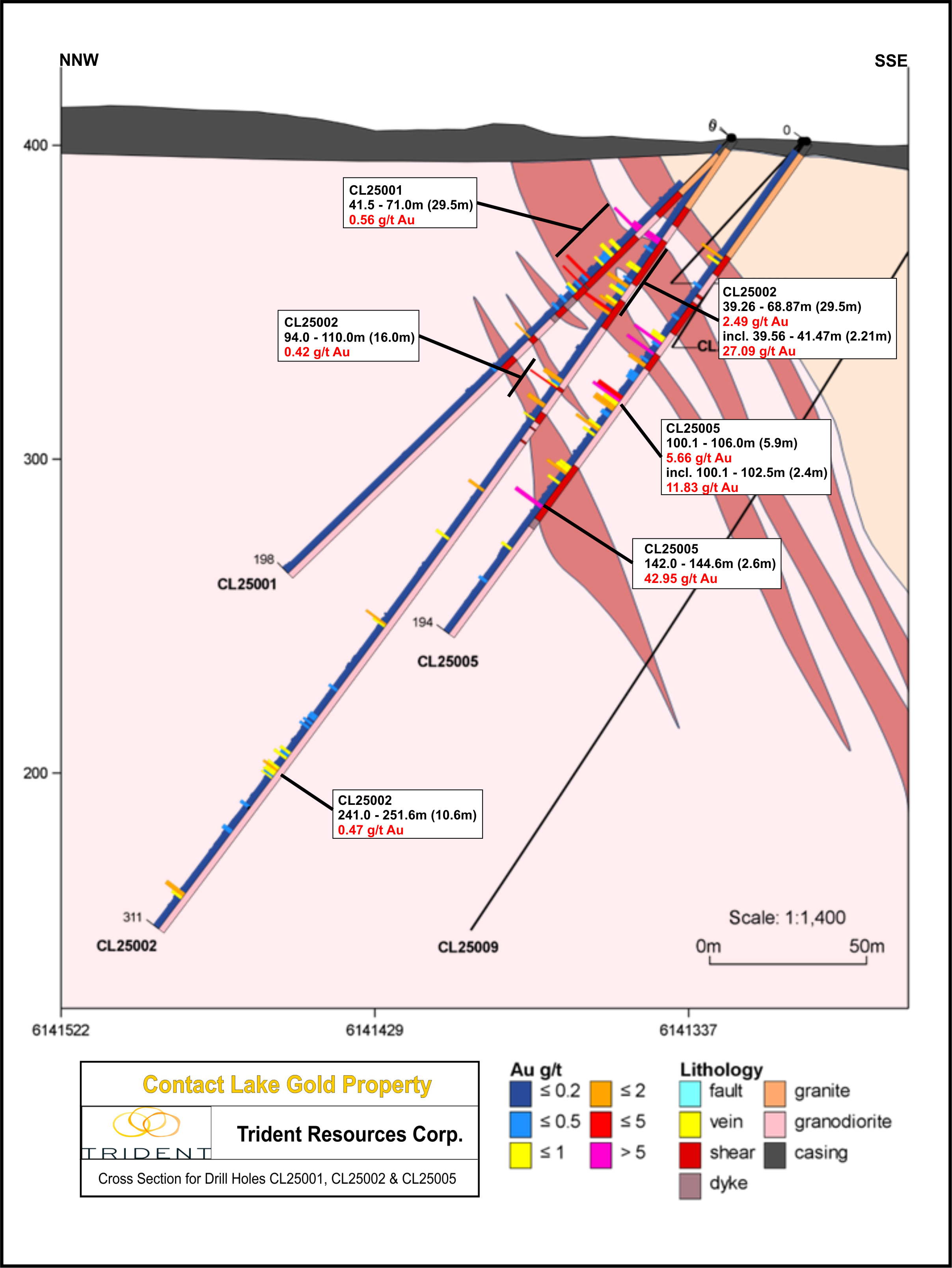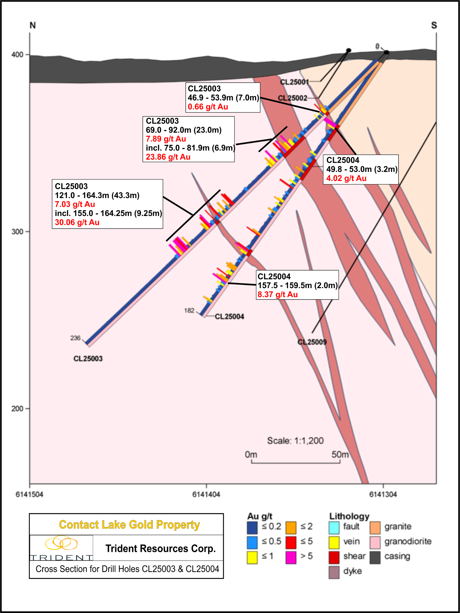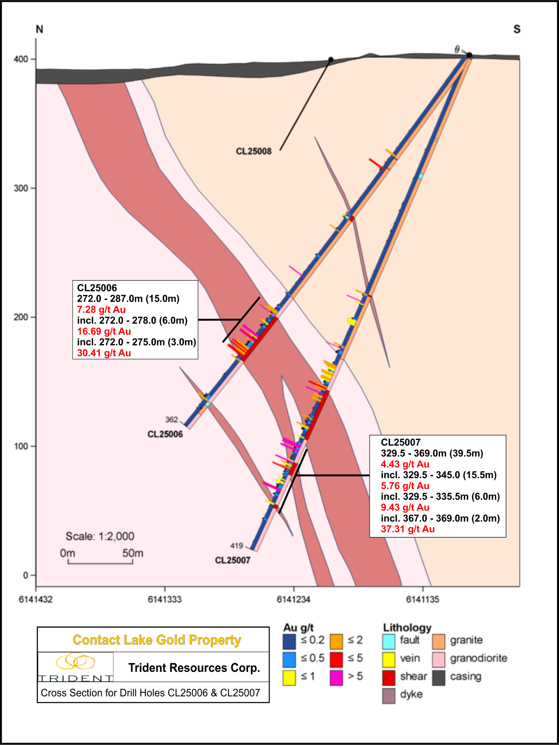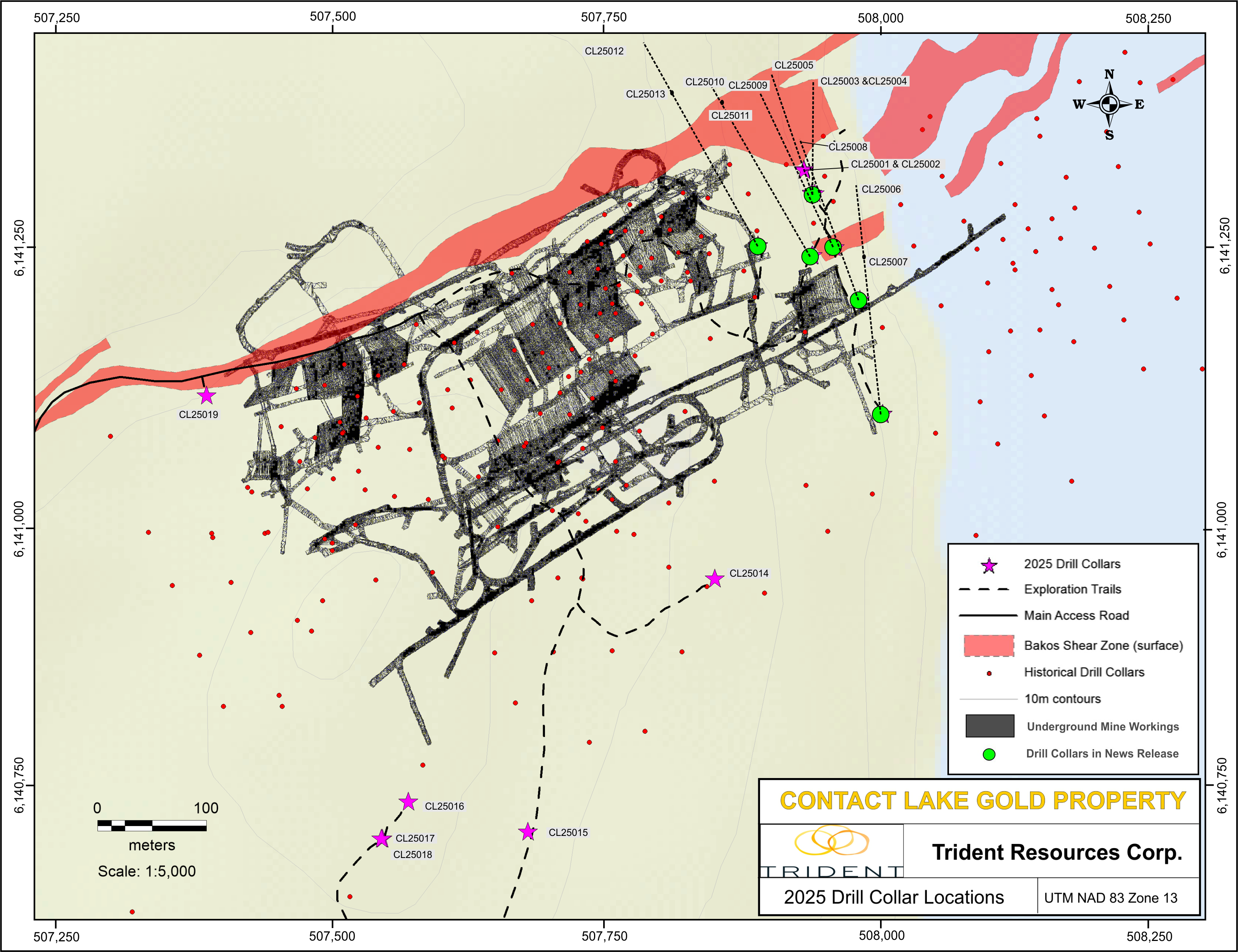 Vancouver, BC, 13. Januar 2026 / IRW-Press / Trident Resources Corp. (TSXV: ROCK) (OTCQB: TRDTF) (Trident oder das Unternehmen) freut sich, zusätzliche positive Ergebnisse aus 10 weiteren Diamantbohrlöchern bekannt zu geben, die während des Bohrprogramms des Unternehmens im Herbst 2025 auf dem Projekt Contact Lake absolviert wurden. Bislang hat das Unternehmen die Analyseergebnisse von 13 der insgesamt 19 Bohrlöcher veröffentlicht. Die Bohrlöcher, über die in dieser Mitteilung berichtet wird, wurden allesamt nordöstlich der bestehenden unterirdischen Mineninfrastruktur niedergebracht, um diesen Bereich auf laterale Erweiterungen der Goldmineralisierung in relativ geringen Tiefen zu erproben. Die Bohrlöcher CL25014 bis CL25019 zielten auf die Erweiterung der Mineralisierung unterhalb der bekannten Abbaustätten ab und ihre Analyseergebnisse stehen noch aus. Darüber hinaus bereitet sich das Unternehmen auf ein umfassendes anschließendes Winterbohrprogramm vor, das in Kürze aufgenommen werden soll.