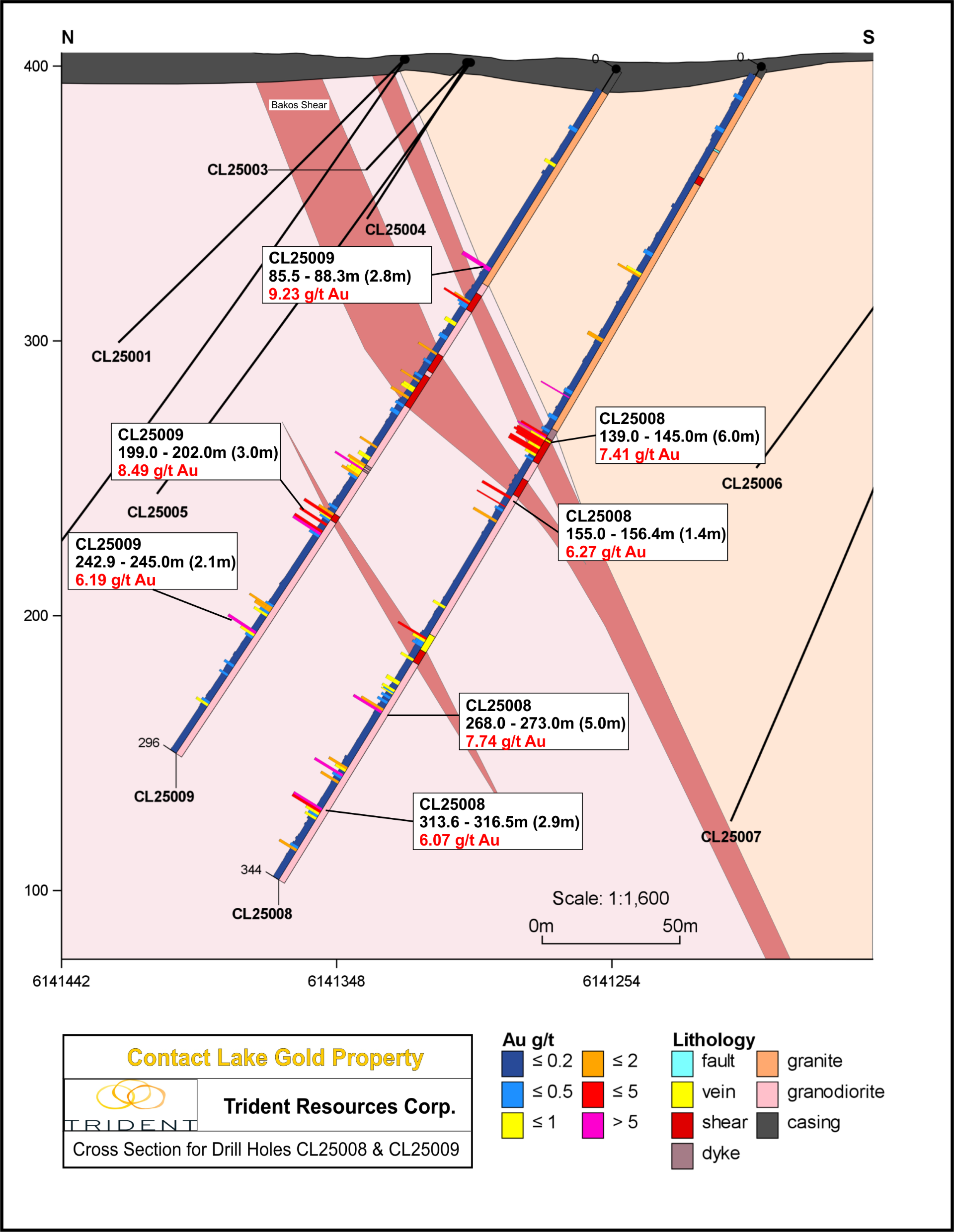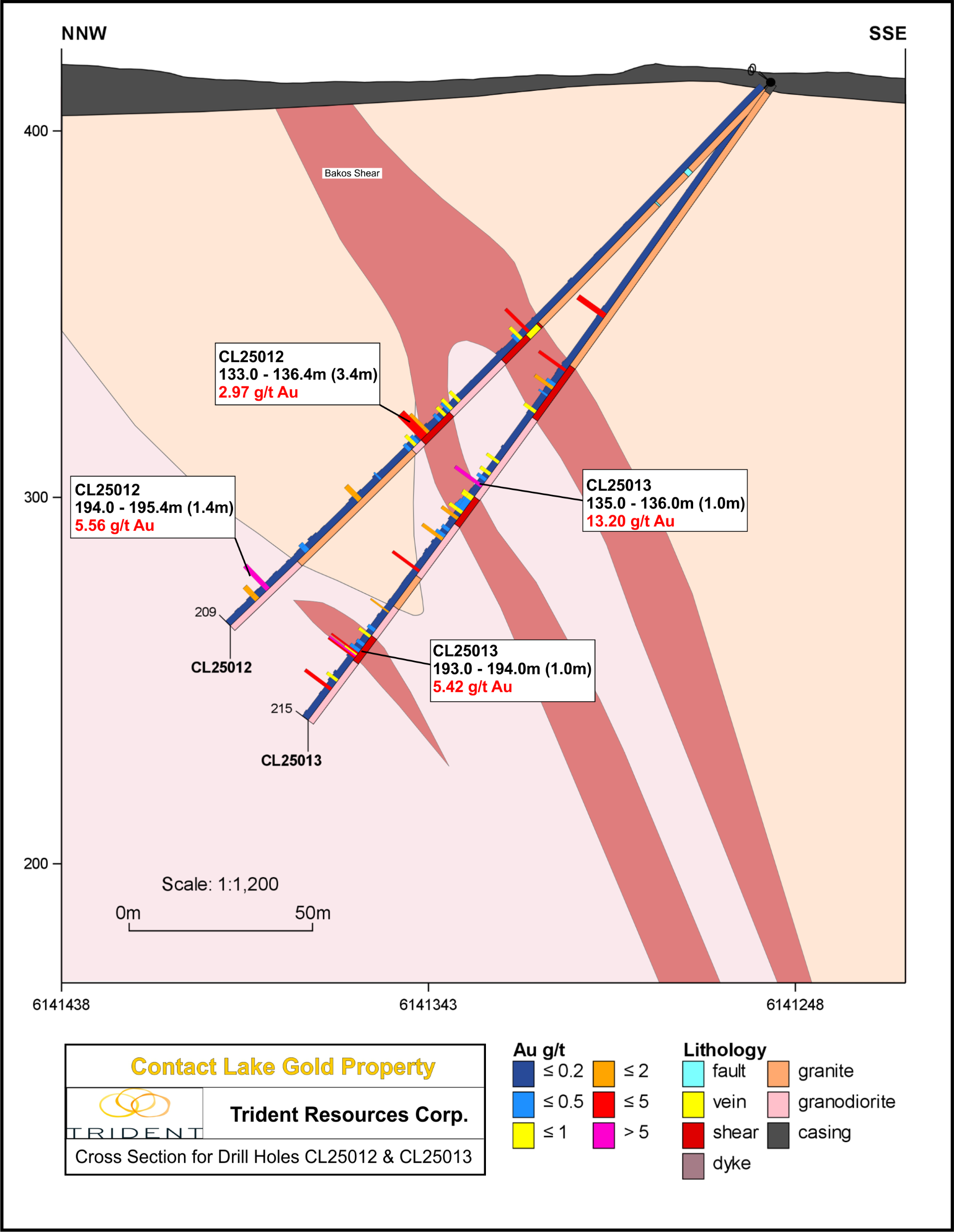 In allen der ersten 13 Bohrlöchern wurden mächtige Scher- und Alterationszonen mit einer beträchtlichen Goldmineralisierung in einem Gebiet ohne bekannte Produktion und mit geringer historischer Bohrdichte durchteuft. In der Bakos Shear Zone wurde eine hochgradige Goldmineralisierung im Hangenden (oben) und dem Liegenden (unten) des Hauptwirtsgesteins der Goldmineralisierung durchschnitten. Die bisherigen Analyseergebnisse stimmen Trident sehr positiv, da sie belegen, dass das orogene Goldmineralisierungssystem bei Contact Lake sowohl lateral als auch in der Tiefe fortbesteht. Das Unternehmen wird die Exploration und Bohrungen zur Ermittlung neuer mineralisierter Zonen systematisch fortsetzen, da das Team die kürzlich entdeckte hochgradige Goldmineralisierung weiter ausbauen möchte.